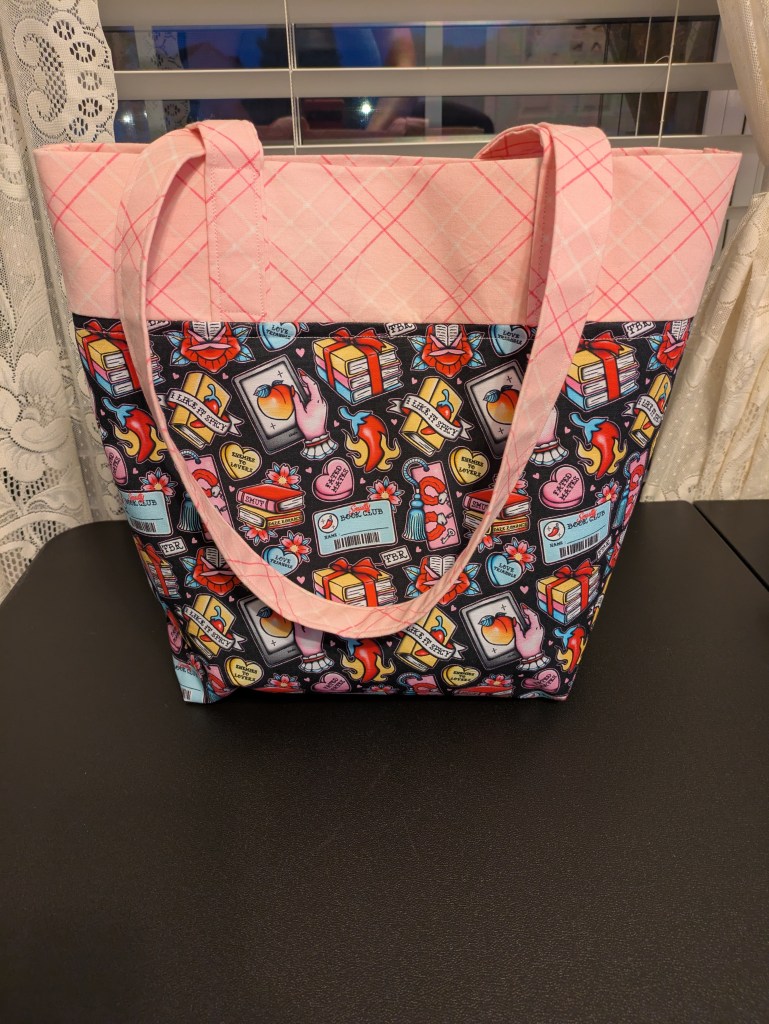 This was so much fun to sew! It’s a sturdy tote that stands up on its own. It’s fully lined with two interior pockets, but my favorite part is the exterior fabric — if you’re a romance reader, this needs to be on your TBR!